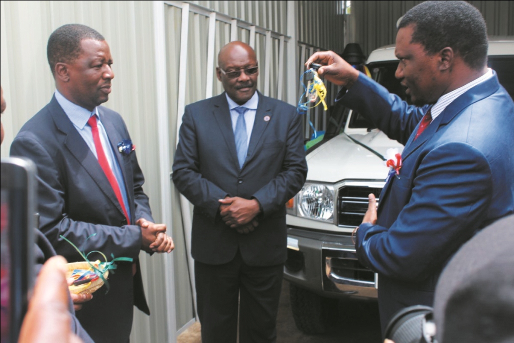 CBZ Executive director, Never Nyemudzo hands over the donated car keys to Minister of Transport and Infrastructure Development Pem Sec Obia Chinyere while Dr Davis Parirenyatwa looks on