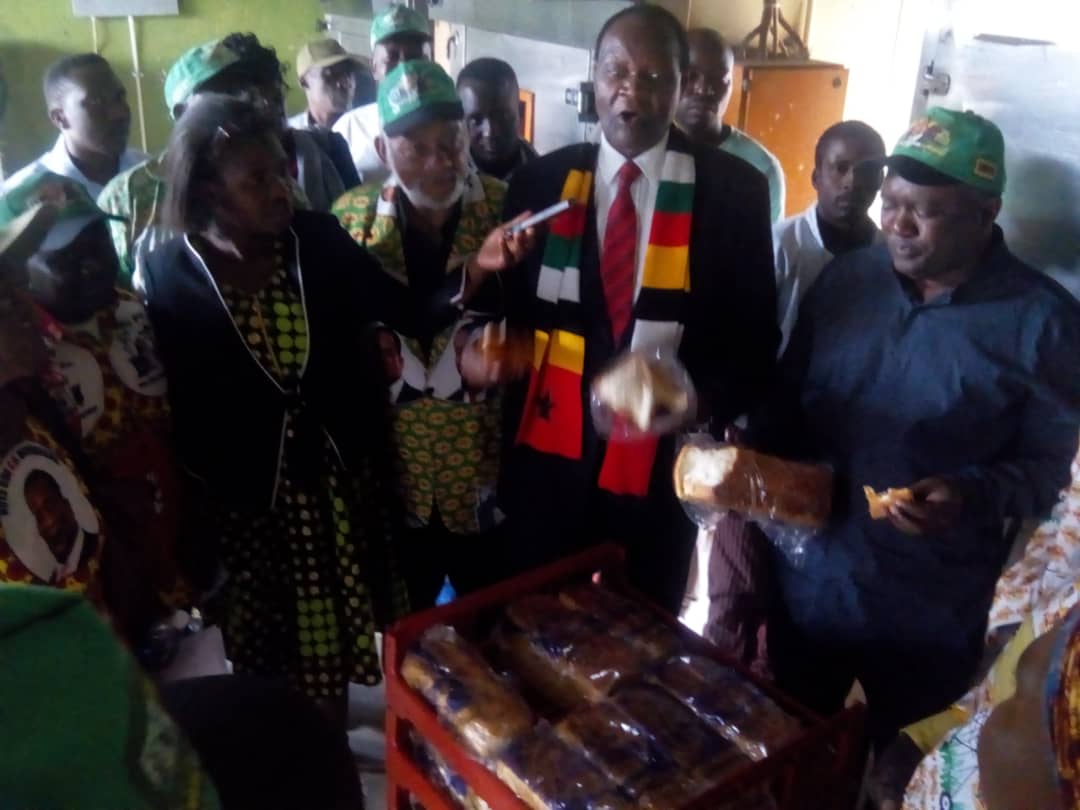 Chadzamira (right) with Zanu PF politburo member Josiah Hungwe (with scarf) and party supporters at a bakery owned by Omar (third from right) at Rutenga