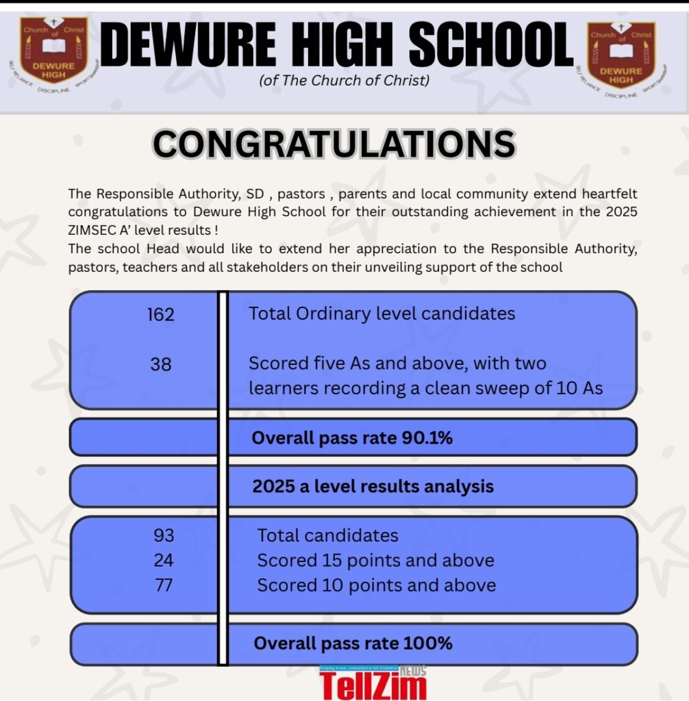 GUTU – Dewure High School, run by the Church of Christ in Gutu, has recorded outstanding results in the 2025 Zimbabwe School Examinations Council (ZIMSEC), attaining a 90.1% Ordinary Level pass rate while maintaining a 100% pass rate at Advanced Level, highlighting its growing reputation as a centre of academic excellence.