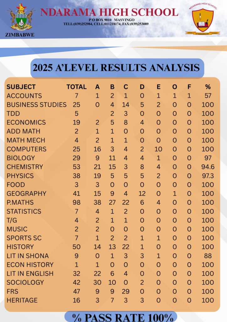 The results highlight Ndarama High’s continued commitment to academic excellence and its reputation as a leading school in Masvingo Province.