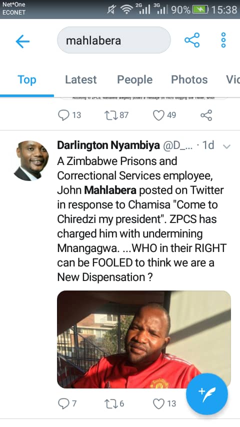 A Zimbabwe Prisons and Correctional Service (ZPCS) officer at Chiredzi Prison, John Mahlabera, is set to appear before a disciplinary hearing on June 12 charged with undermining President Emmerson Mnangagwa by allegedly posting a Twitter message which supposedly referred to opposition leader, Nelson Chamisa as ‘my president’.